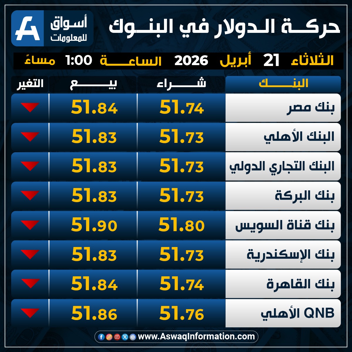 سعر الدولار اليوم.. ننشر لكم التفاصيل التي طرأت على العملة الخضراء التي شهدت تراجعًا بمنتصف تعاملات اليوم الثلاثاء 21 أبريل 2026 مقابل الجنيه، وذلك بحسب شاشات التداول المعلنة بالبنوك الحكومية والخاصة العاملة داخل السوق المصرفية.