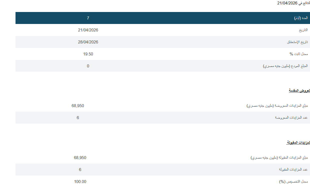 وتقدم للعطاء، 6 بنوكًا، قبلت طلباتها جميعًا، وسيكون تاريخ استحقاقها 21 أبريل الجاري، بحسب البيانات المنشورة عبر الموقع الرسمي للبنك.