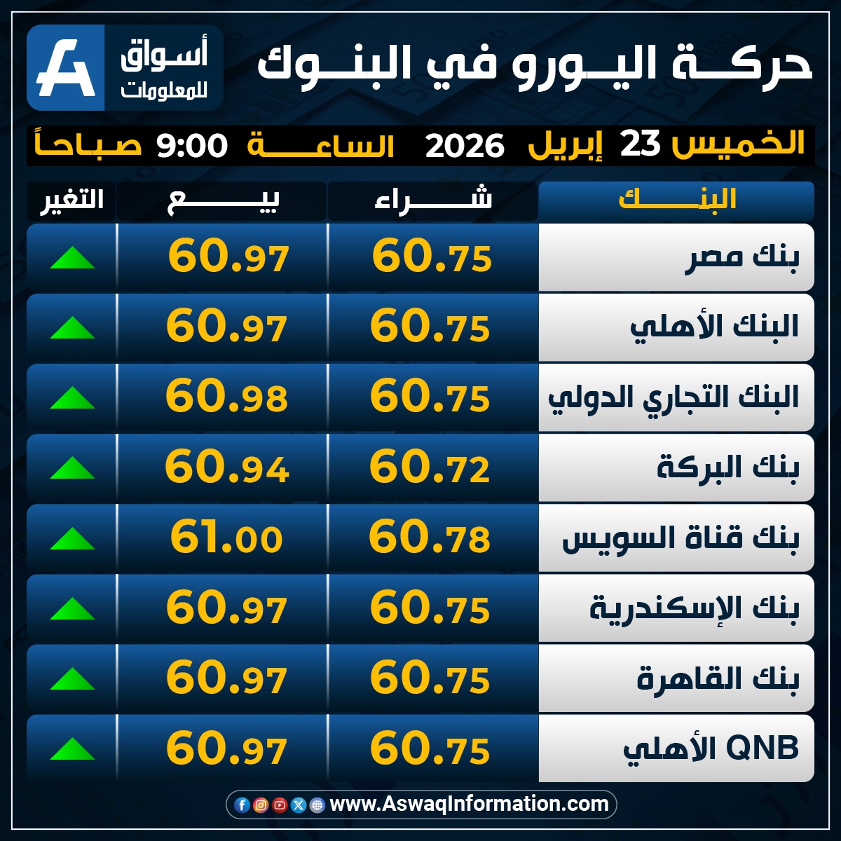وصعد سعر اليورو في البنك الأهلي المصري نحو 60.75 جنيه للشراء، وسعر 60.97 جنيه للبيع